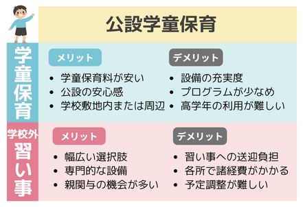 公設学童保育は、自治体が運営する放課後の子ども向け施設で学校敷地内または近隣にあり、主に共働き家庭の小学生を対象としています。低料金で利用でき、地域に密着した安心感が特徴です。主に宿題の見守りや自由遊びが中心で、地域の子どもたちと交流しやすい点が魅力です。低学年優先の為、中高学年の利用が難しく、プログラムの多様性や個別対応が限られることがあります。