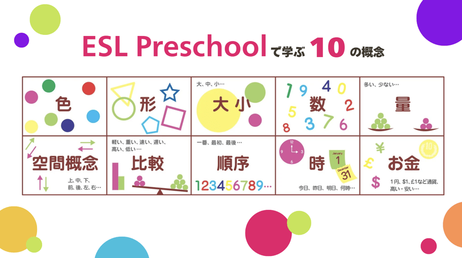 プリスクールでは、「ESL Collegeで学ぶ6つの分野」と「英語レッスンで学ぶ10の概念」を基盤としたクロスカリキュラムのアプローチを取り入れており、欧米の教育を基盤にお子様の可能性を引き出します。これは、異なる教科やアクティビティを組み合わせて、より深い学びと楽しい体験を提供する教育方法です。お子様にとって、ただの英語学習を超えた豊かな成長の機会となります。モンテッソーリ教育の理念を取り入れ自己教育力を育み、世界基準の教育法でお子様の才能を引き出します。